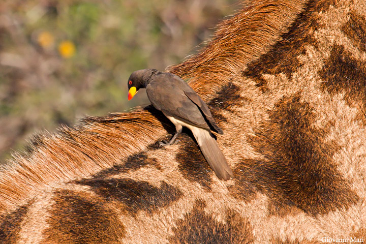 Yellow-billed Oxpecker on Giraffe, Moremi GR